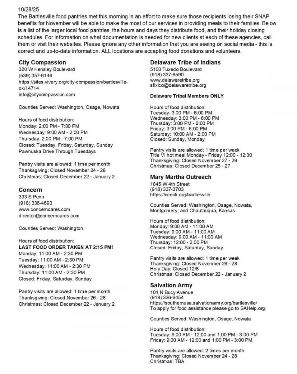 As some Bartlesville residents prepare for a loss of SNAP benefits in November, local food pantries are coordinating efforts to ensure families have access to meals throughout the holiday season. Several agencies have announced updated distribution schedules and holiday closures, while continuing to accept food donations and volunteers.