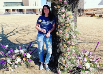 Whitney Virden, the owner of Roots and Blooms in Bartlesville, “flower bombed” a tree at the Tower Center at Unity Square.