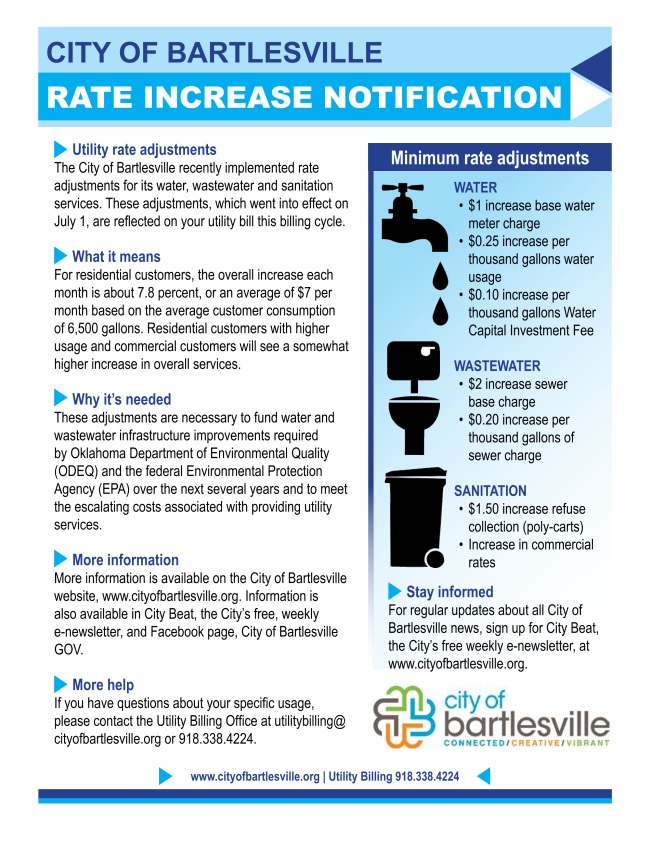 Rate adjustments for City of Bartlesville utility customers went into effect July 1 and will be reflected on the July utility bill.