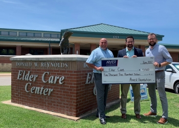 The Arvest Foundation recently announced a $5,500 donation to Elder Care. Arvest Wealth Management trust officer Aaron Tesavis presented the check to Elder Care executive director Cordell Rumsey and Foundation Physical Therapy director Josh Lindblom.