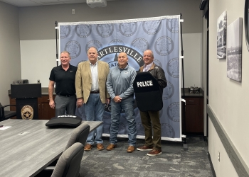 Scott Walton of the Rogers County Sheriff's office and founder of the non-profit, STANDFirst, was at the Bartlesville Police department Thursday afternoon to present BPD with ballistic shields that offer added safety measure for officers in schools. Walton, talked about his plans with the ballistic shields.