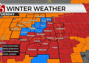 According to Chief Meteorologist Travis Meyer at News on 6, things will be just cold enough as rain mixed with sleet arrives around 1:00 p.m. in Bartlesville and 2:00 p.m. in Coffeyville. Meyer adds that temperatures will be in the mid-30s until the precipitation arrives, which will send the temperature to near freezing conditions. He says snow will follow and it could be heavy at times.