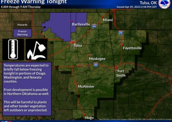 The National Weather Service in Tulsa issued a Freeze Warning for early Thursday morning from 4 a.m. until 9 a.m. for Osage, Nowata and Washington counties including the cities of Bartlesville, Dewey, Pawhuska and Nowata.