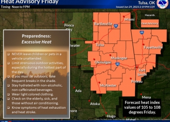 According to the National Weather Service in Tulsa, heat index values are expected to be near 107 degrees on Friday, prompting the advisory. The weather service says hot temperatures and high humidity will combine to create a dangerous situation in which heat illnesses are possible. The heat advisory does not include Osage County in Oklahoma or Chatauqua County in Kansas. However, officials still urge caution across the entire region.