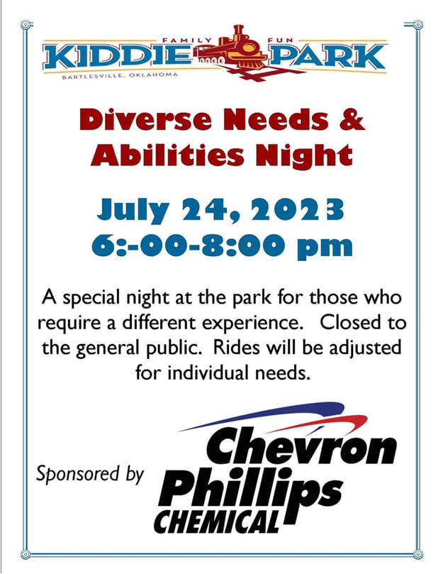 Kiddie Park will be closed to the general public that night. Rides will be adjusted for individual needs. The evening is sponsored by Chevron Phillips.