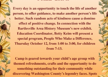 The Bartlesville Area History Museum will present a special program for ages 7-13, “People Who Make a Difference,” from 1-3 p.m. Thursday, at the museum, located on the fifth floor of City Hall, 401 S. Johnstone Ave. The program is focused on random acts of kindness and will be led by Education Coordinator Betty Keim.