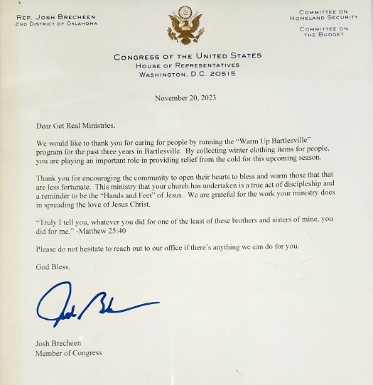 WARM UP BARTLESVILLE has been so well received in the community that word got back to US Representative Josh Brecheen. Brecheen sent a letter of thanks to Get Real Ministries for their effort to help those on need.