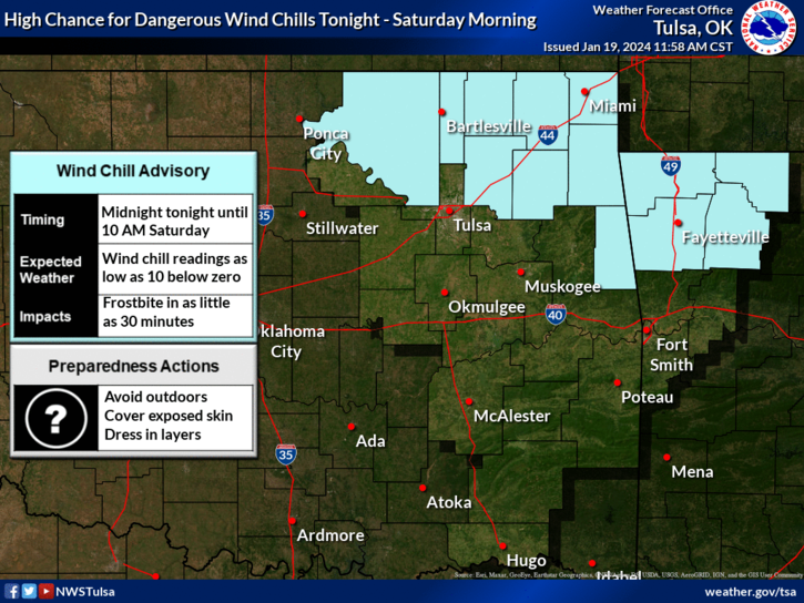 Additionally, dangerous wind chill values from near zero to around 10 below zero are expected again Friday night across much of northeast Oklahoma, southeast Kansas and northwest Arkansas, which will continue through Saturday morning. A Wind Chill Advisory is in effect from Midnight tonight to 10 a.m. Saturday morning.