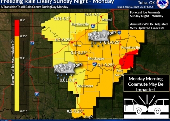 Accumulating ice is possible and the Monday morning commute may be impacted. The National Weather Service is forecasting anywhere between a glazing to 1/10th of an inch of ice across Nowata, Osage and Washington counties. Higher amounts of ice, up to a quarter-inch, are possible in Tulsa proper and areas east of Tulsa through northwest Arkansas.