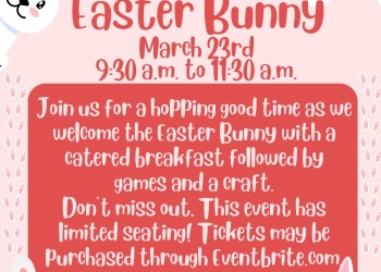 Kids ages 10 years or younger are invited to enjoy time with the Easter Bunny, including a catered breakfast, games and a craft. Families can also enjoy selfies with the Easter Bunny, win a prize during a hopping sack race or enjoy the Easter-themed coloring station.