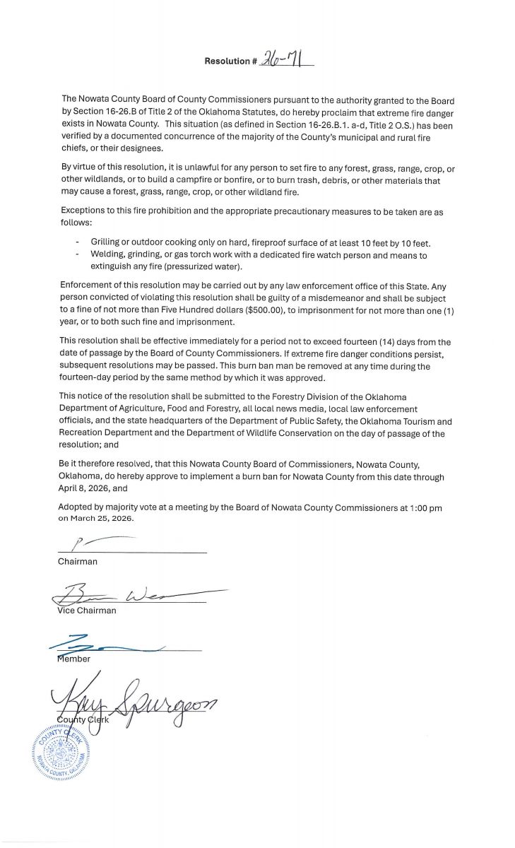 Nowata Co. Commissioners Issue Burn Ban