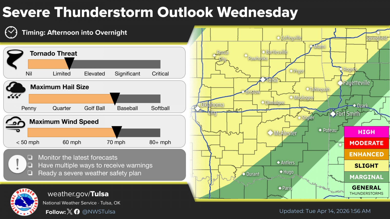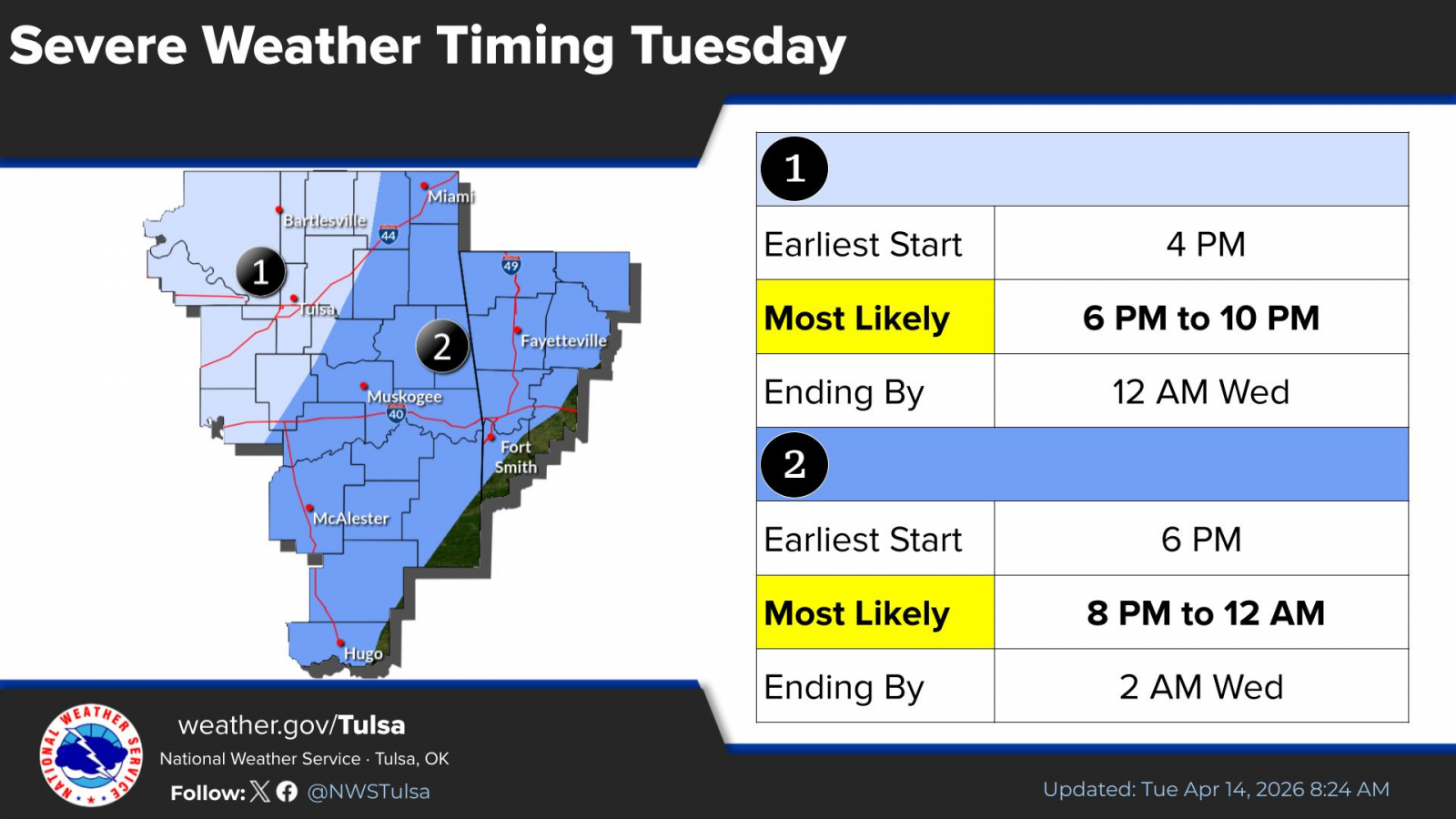 Late afternoon and evening time frames are most favored for severe weather on Tuesday. Current data indicate the severe weather threat will end west of a line from Vinita to Henryetta by midnight Tuesday night. The time frame for severe weather in the listening area is as early as 4 p.m., where the most likely time frame is between 6 p.m. at 10 p.m.