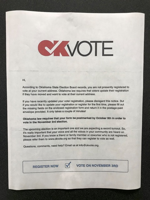 State Election Board Secretary Paul Ziriax said state and county election officials are not affiliated with OKVOTE nor with this mailing. Although they know OKVOTE has good intentions, Ziriax said the mailing has caused confusion by mistakenly telling some registered voters that they are not registered to vote at their address. He said they encourage voters who received this letter to use the official OK Voter Portal or contact their County Election Board to confirm their voter registration.