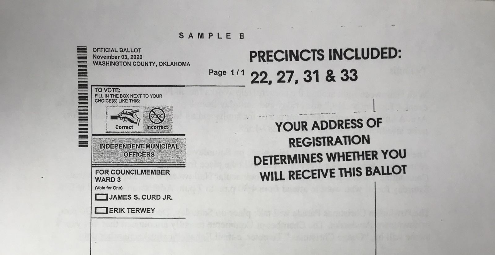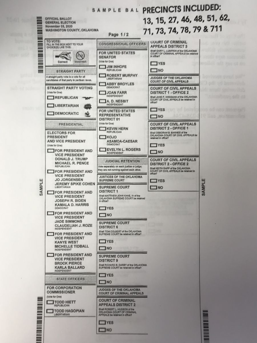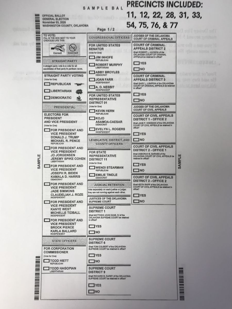 The Washington County Election Board has released sample ballots for the Tuesday, Nov. 3rd General Election and the City of Bartlesville Ward 2 & Ward 3 Election.