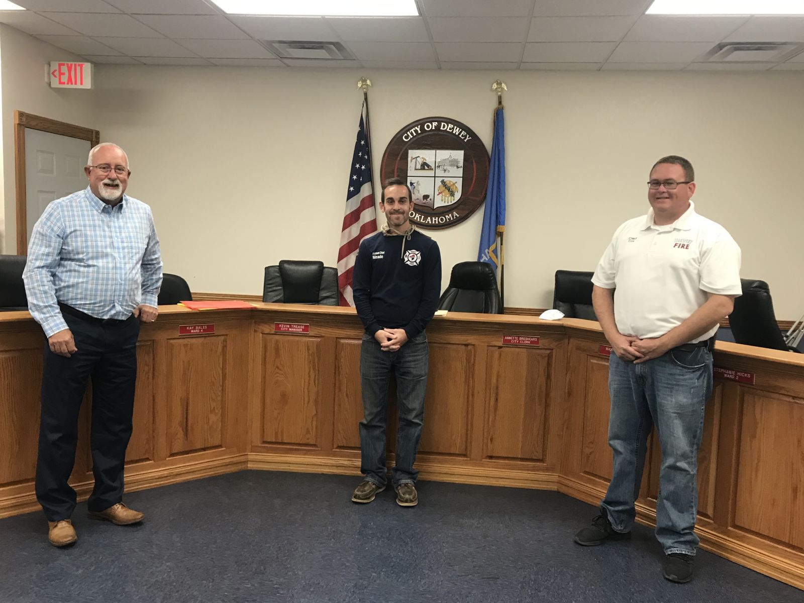 Pictured below from left to right: Mayor Tom Hays, Dewey Assistant Fire Chief Cody Meade, Dewey Fire Chief Jacob Cox.
