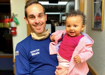 Meade performed lifesaving procedures on the little girl (pictured right with Meade) late Halloween evening. Mayor Tom Hays recounted the story about the girl's father running up to the Dewey Fire Department holding his lifeless child who had lodged a piece of candy in her throat; she was not breathing. Mayor Hays said Meade immediately got out of a fire truck as he pulled into the station and went into action.