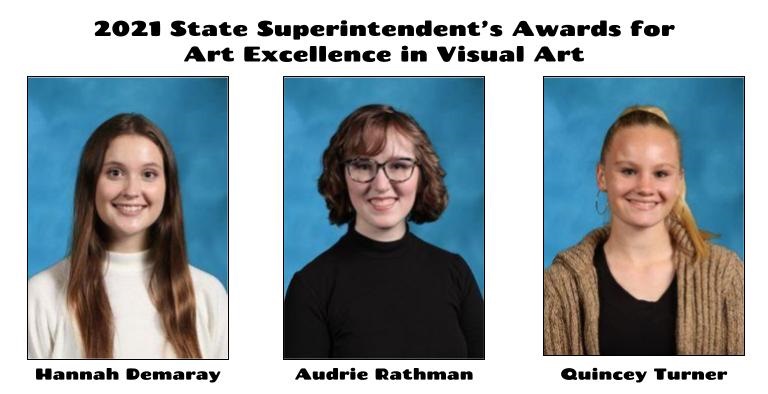 Hannah Demaray, Audrie Rathman, and Quincey Turner of Bartlesville High School have earned 2021 State Superintendent's Awards for Arts Excellence in Visual Art.