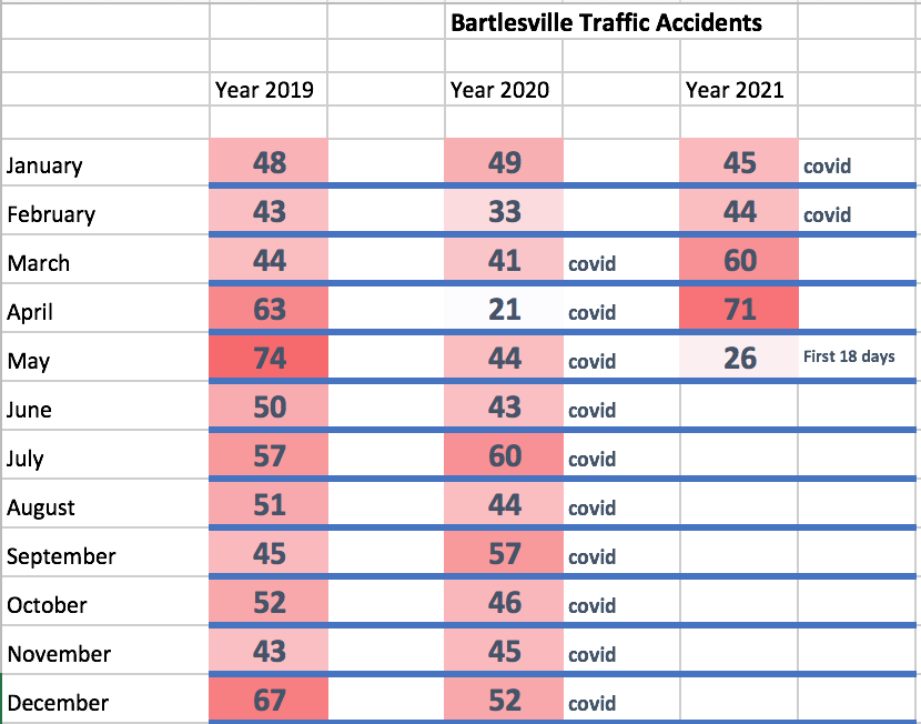 According to data from the Bartlesville Police Department, there have already been 26 traffic accidents in the first 18 days of May. A data table provided by the BPD is pictured below.
