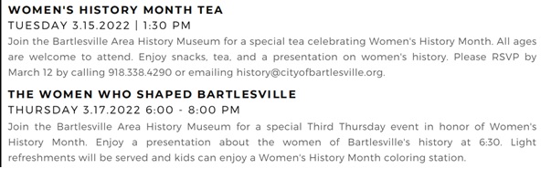 In January, The Council approved Contract and Terms and Conditions between the Bartlesville Area History Museum/City of Bartlesville and the Oklahoma Department of Libraries for ARPA grant funds in the amount of $4,555.00 for the purchase of equipment, software and fees for traveling exhibits.