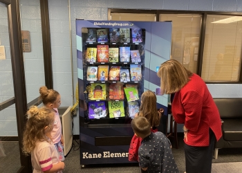 The machine was funded by a grant from the Walmart Distribution Center, with representatives Jayme Hancock and Misty Dumond on hand as school principal Tammie Krause cut the ribbon. Jolene Bryant and Jamie Beckloff represented Kane Elementary PTO, which helped fund the books to stock the machine.