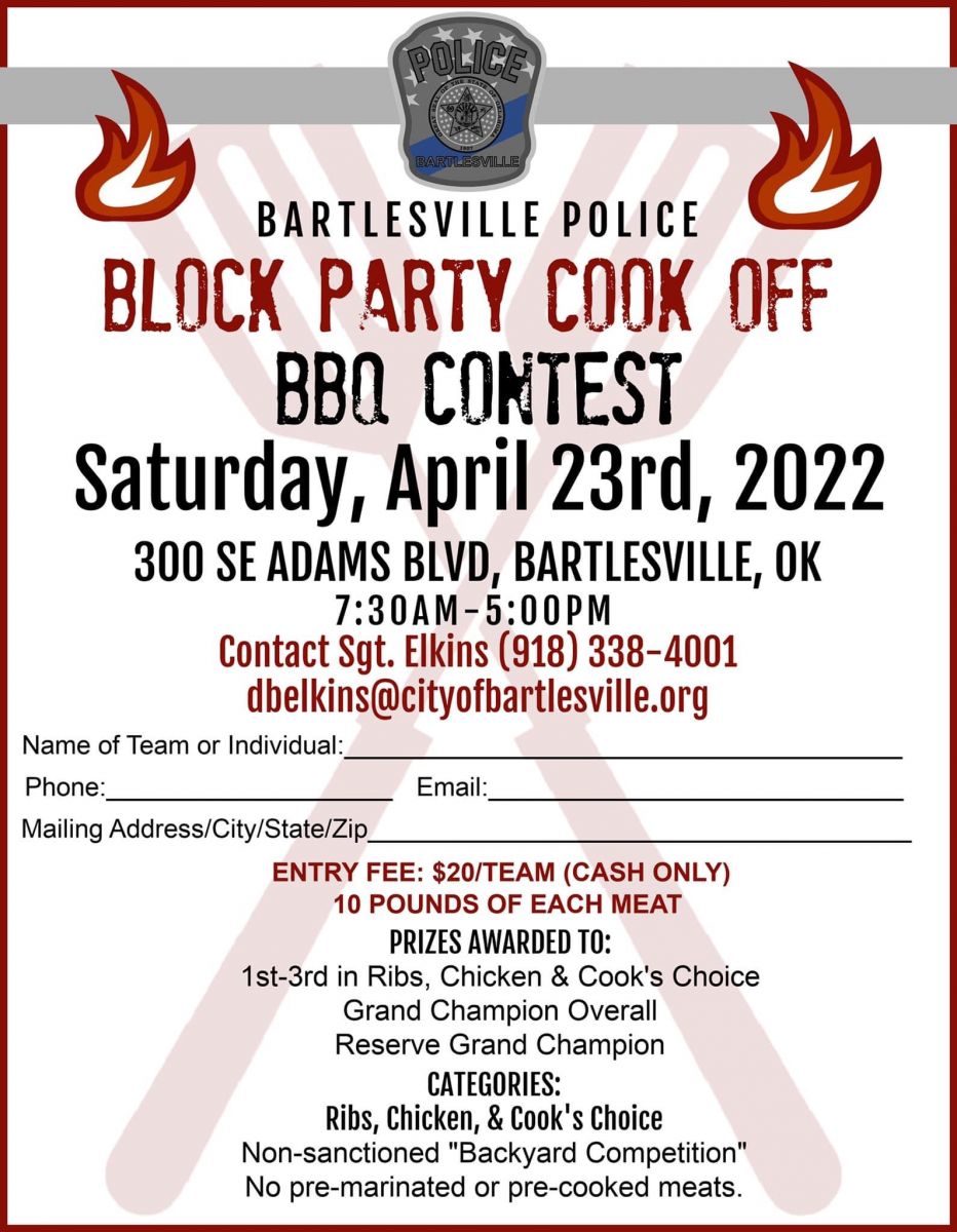 Bartlesville Police Sergeant Daniel Elkins says there will be a block party cook-off that same day, but the hours will be extended for the occasion to make time for participants. He says the BBQ contest will take place at 300 SE Adams Boulevard from 7:30 a.m. to 5:00 p.m.