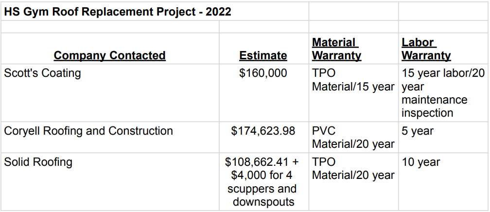 Other quotes that were up for consideration by the Board for the high school gym's roof replacement are pictured below.
