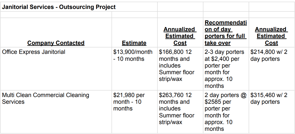 Office Express Janitorial would then be selected to provide janitorial services for the 2023 fiscal year in the amount of $13,900 per month for 10 months. A breakdown of the companies up for consideration can be found below.