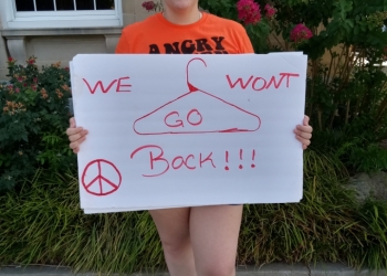 Ashley Romo-Ruiz, age 28 and a mother of three, held up a sign with a hanger symbol as part of her protest. Romo-Ruiz says she is upset that Roe vs Wade was overturned and hopes that by protesting she can educate others on the importance of abortion being a medical procedure.