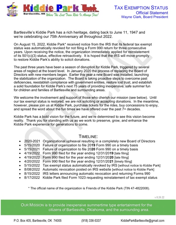 "On August 15, 2022, Kiddie Park received notice from the IRS that its federal tax exemption status was automatically revoked for not filing a Form 990 for three consecutive years. Upon receiving the notice, the organization immediately applied for reinstatment of its 501(c)(3) status, retroactively."