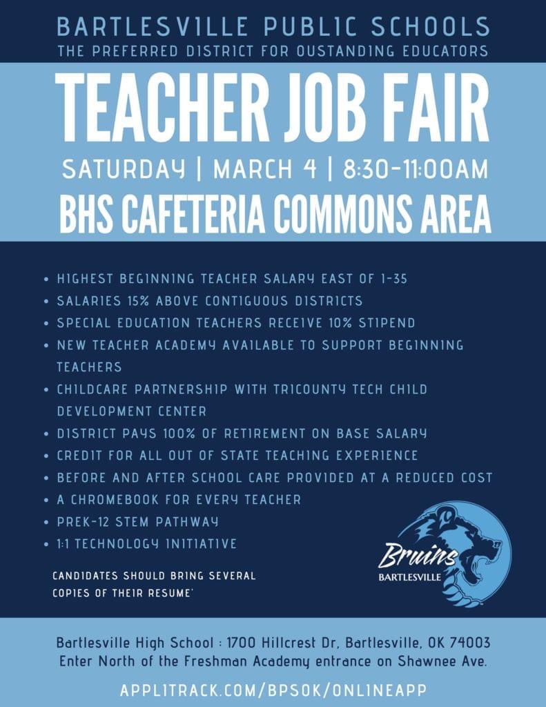 In order to do so, BPSD will host a teacher job fair on Saturday, March 4, from 8:30 to 11:00 a.m. at Bartlesville High School (BHS), 1700 Hillcrest Drive. The event will be held in the BHS cafeteria commons. Those attending the teacher job fair will need to enter north of the Freshman Academy entrance on Shawnee Avenue.
