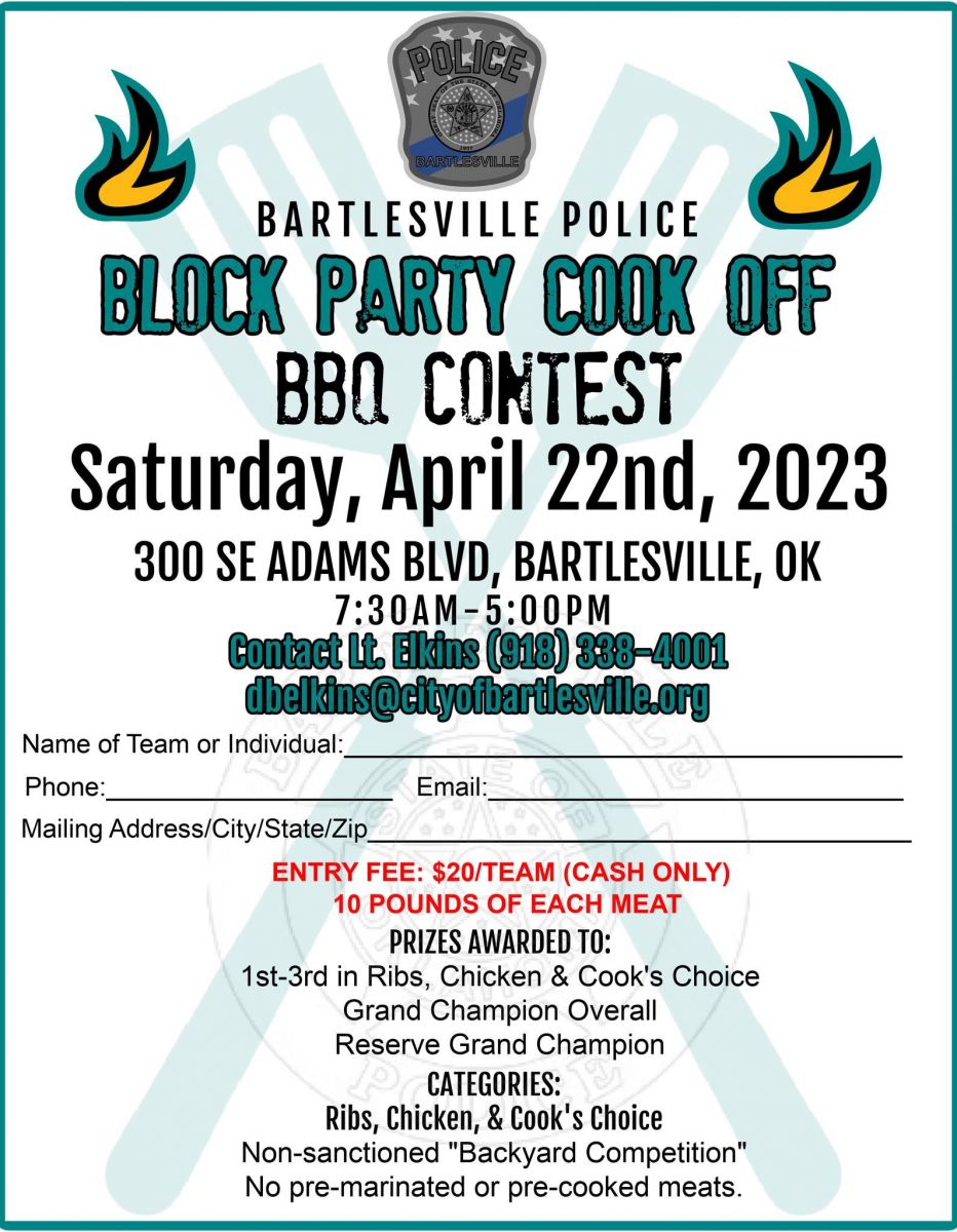 There will be a block party cook-off that same day as the BBQ contest will take place at 300 SE Adams Boulevard. You do not have to cook in all three categories to take part in the contest. The categories include: chicken, ribs, and cook's choice.
