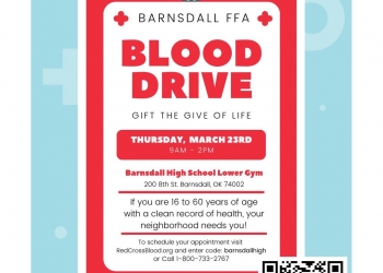 Barnsdall FFA is hosting a blood drive on March 23 from 9 a.m. to 2 p.m. at the Barnsdall High School Lower Gym.