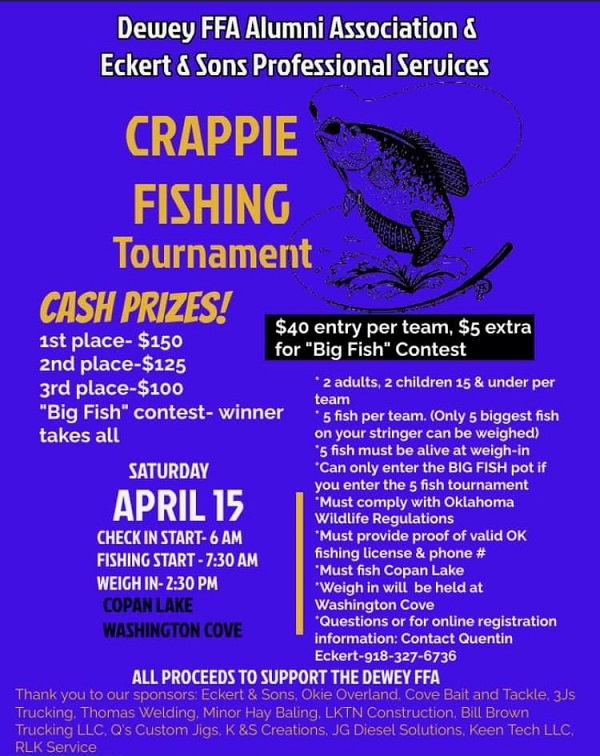 David Hughbanks appeared on COMMUNITY CONNECTION to let everyone know that The Dewey FFA Alumni is hosting the 2nd Annual Crappie Fishing Tournament on Saturday, April 15 at Copan Lake. Check-in starts at 6am at Washington Cove with lines in the water at 7:30am and weigh-in at 2:30pm.