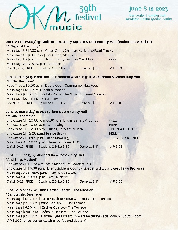 The OKM Music is held each June was named for the Austrian classical composer Wolfgang Amadeus Mozart. During the years, programs expanded to include everything from classical and contemporary music to bluegrass, gospel and popular music. As the festival continued to evolve and bring on more variety in music genres, the time was ripe for a name change. In 2017, the OK Mozart Music Festival became known as OKM Music, still retaining its early heritage with OKM, but going a step further to include all music.