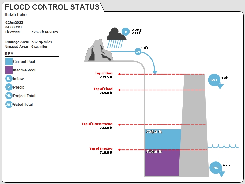 - Pool elevation is 728.28 feet on 05JUN2023 04:00 hours.