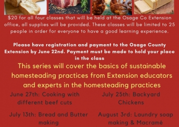 Class sizes are limited and filling fast. Payment and registration are due to the Osage County Extension by June 22 to hold your place in the class. For more information call 918-287-4170 or email at cheyenee.patrick@okstate.edu.