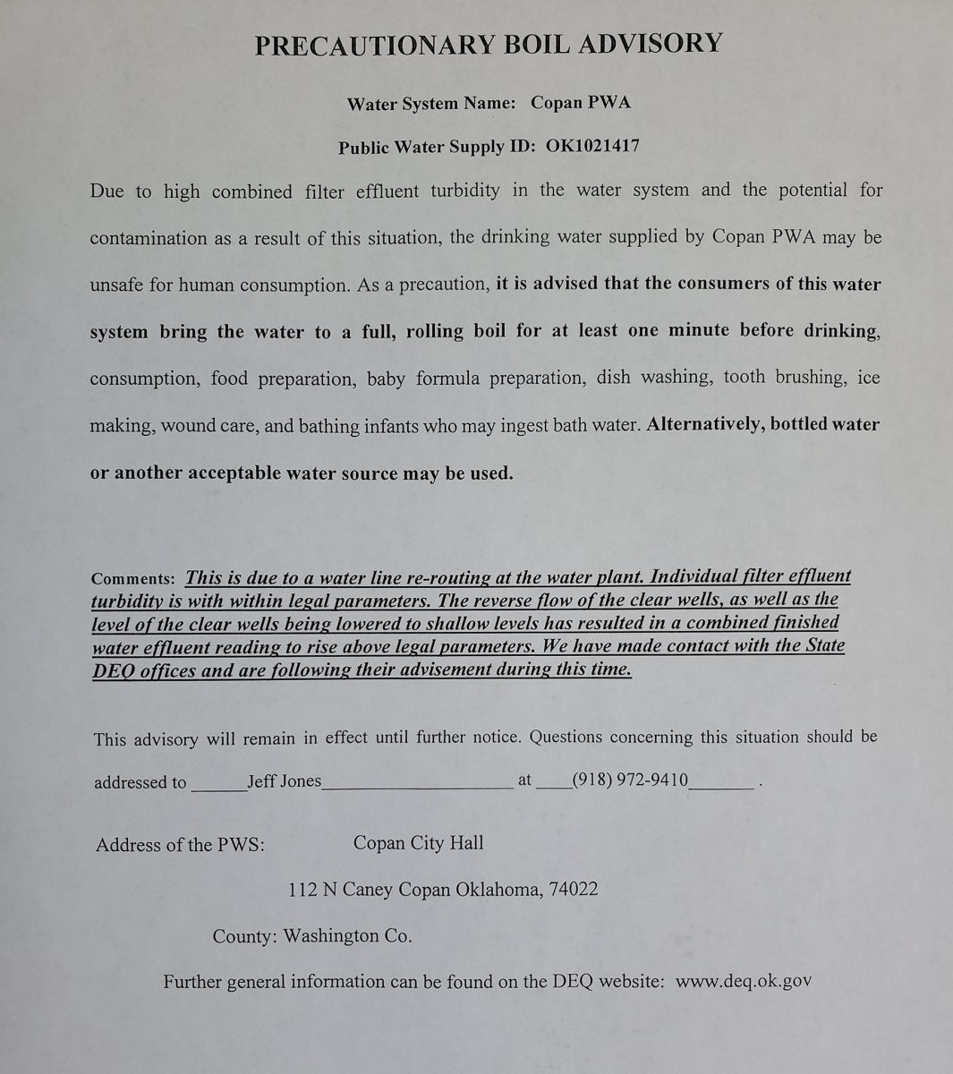 The town of Copan and surrounding areas are under a water boil order until further notice.