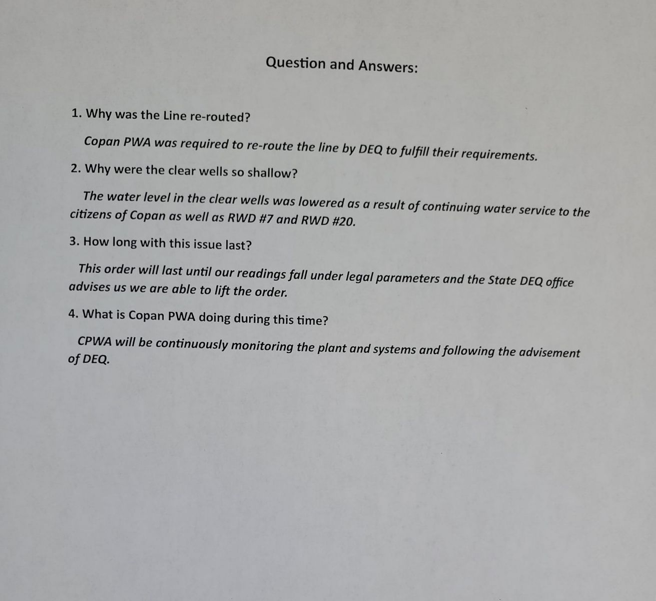 According to a notice from the Copan Public Works Authority, a water line re-routing at the water plant combined with reverse flow from clear wells and shallow water levels in the wells have caused finished water effluent levels to exceed legal levels.