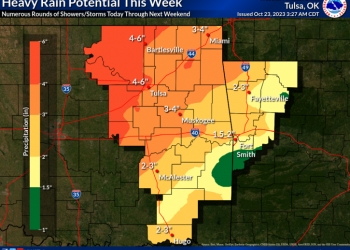 Numerous rounds of showers and a few thunderstorms are expected starting later Monday night and continuing through the weekend. More than an inch of rain is likely just about everywhere, with total amounts of 3 to 6 inches expected across much of northeast Oklahoma.
