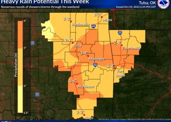According to the National Weather Service in Tulsa, widespread showers and isolated thunderstorms are expected through Tuesday night, mainly across eastern Oklahoma. Locally heavy rainfall amounts will be possible, especially across parts of northeast Oklahoma west of Highway 75.