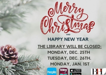 The Bartlesville Public Library will be closed on Monday, Dec. 25th (Christmas Day), Tuesday, Dec. 26th, and Monday, Jan. 1st.