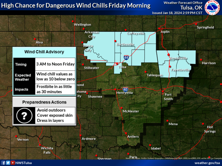According to the National Weather Service in Tulsa, the advisory is in effect from 3 a.m. Friday until noon. Very cold wind chills are expected with values as low as 10 degrees below zero.