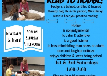 You can now sign up for 15 minute sessions for Saturday afternoons for your child to practice reading with Hodge and his human, Miss Becky.