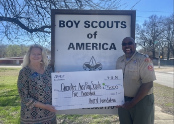 A $5,000 gift from the Arvest Foundation to The Cherokee Area Council Boy Scouts of America will be used to help with scholarships for troop membership costs and uniforms, as well as assist with day camp costs for cub scouts.