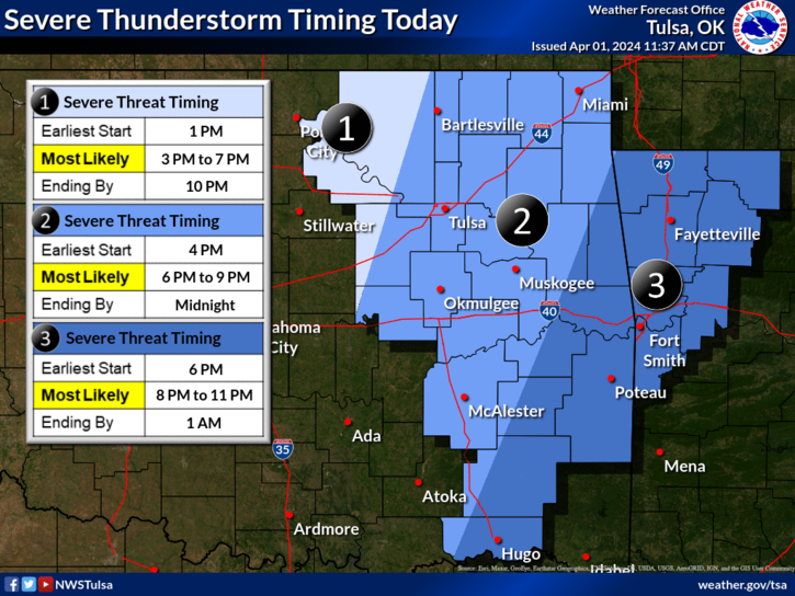 Severe weather is looking more likely with large hail up to softball size, locally damaging winds of 70-80 mph and an elevated threat for tornadoes. The Storm Prediction Center in Norman has increased the risk level to "Moderate" (Level 4 out of 5) for all of Washington and Nowata counties and most of Osage County in Oklahoma. Southeast Kansas is in an "Enhanced" risk (Level 3 out of 5).