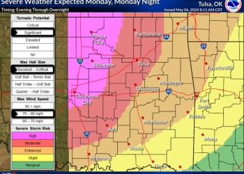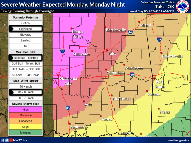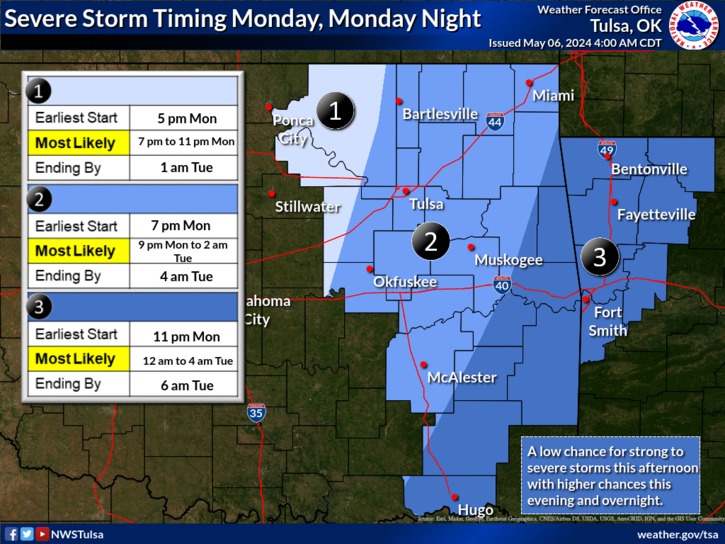 Thunderstorms are expected to develop across central Oklahoma late Monday afternoon and spread into eastern Oklahoma and southeast Kansas during the evening. Severe weather is expected with these storms, along with the potential for significant severe weather across parts of eastern Oklahoma and southeast Kansas.