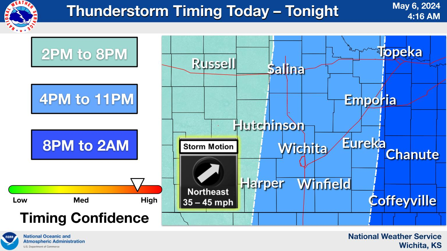 The western half of Osage County and Chautauqua County in Kansas are in a high risk area (Level 5 of 5) for severe weather. Eastern Osage County, Washington County and Nowata County; as well as Montgomery County and Labette County in Kansas are in a moderate risk area (Level 4 of 5).