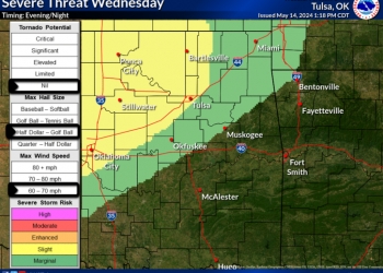 According to the National Weather Service, the threat level has increased from a marginal risk to a slight risk (Level 2 of 5). Chances for a few severe thunderstorms will come Wednesday evening and night across portions of northeast Oklahoma and southeast Kansas, with slightly better chances northwest of I-44.