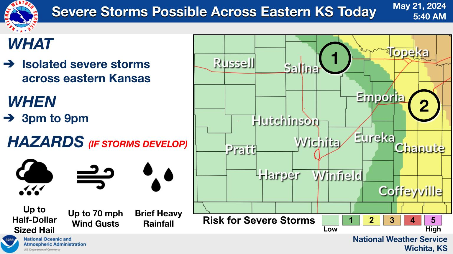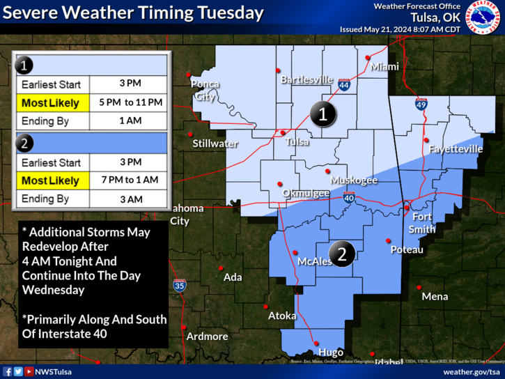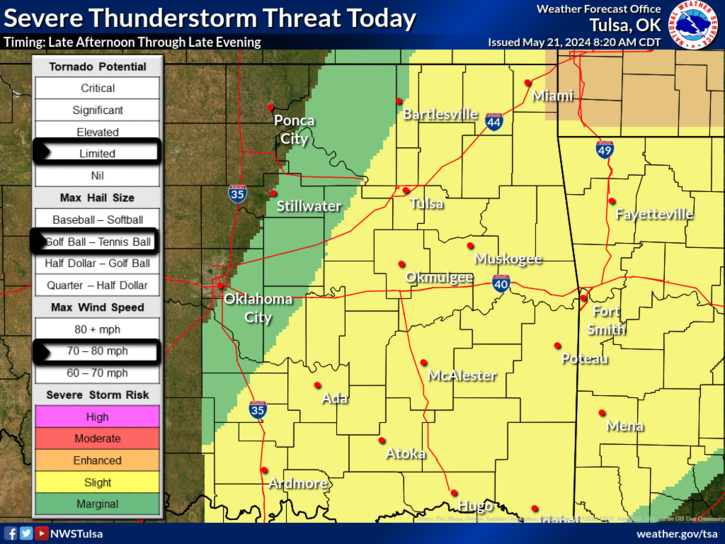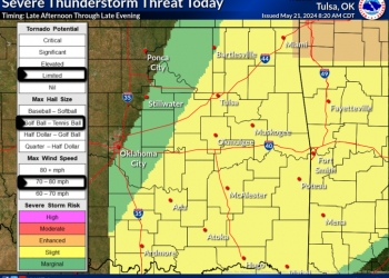 Osage and Chautauqua counties are in a “marginal” risk area (Level 1 of 5) and Washington, Nowata and Montgomery counties are in a “slight” risk area (Level 2 of 5). The main threats include 70-80 mph wind gusts, up to golf ball or tennis ball sized hail and a limited risk of tornadoes.