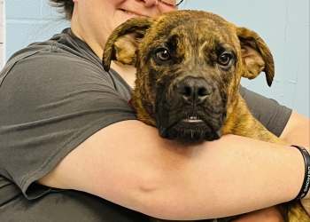 Jari Bowers, volunteer coordinator for the Washington County SPCA introduces a snuggle bug puppy.